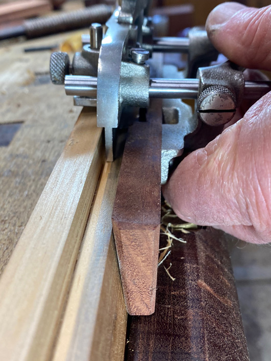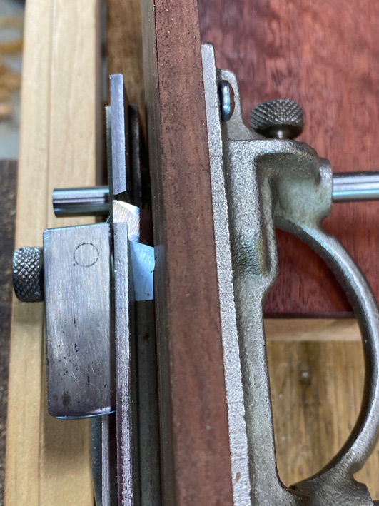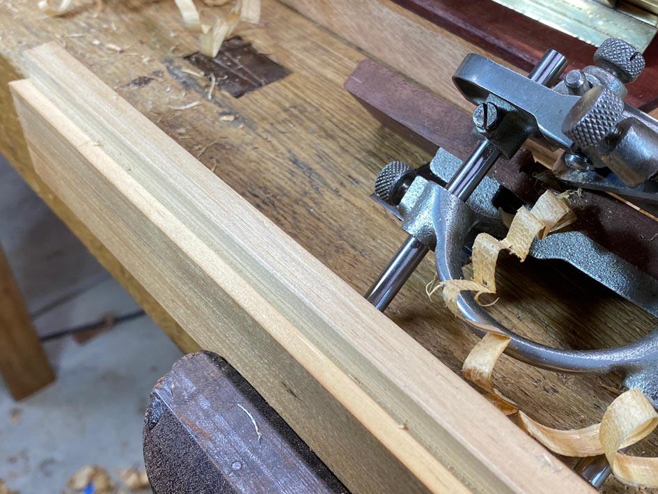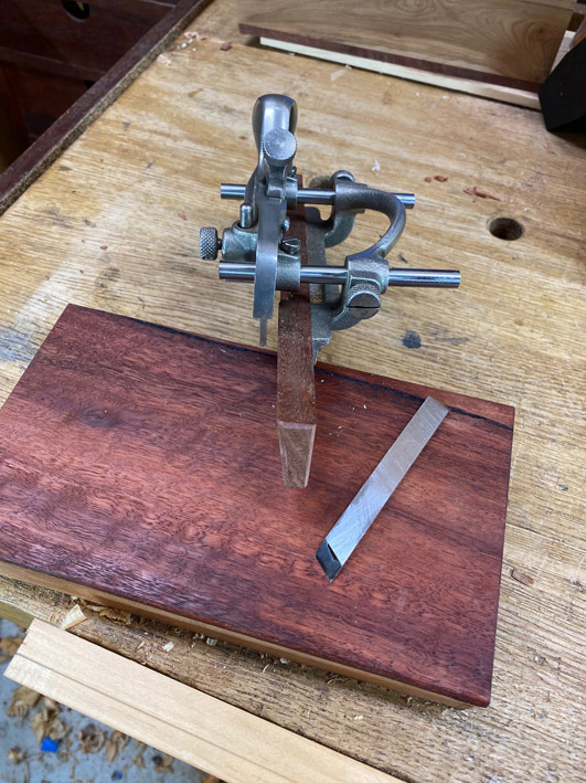 I also wanted to try out an idea I had for positioning the groove, as well as when ploughing into the grain (which would typically cause tearout and a nasty looking groove). The mortise gauge I made (with the fixed blades in a cassette) has a 3mm blade ...