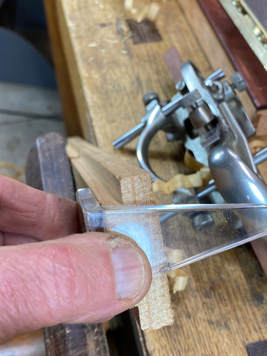 All blades require a relief angle, which is a slight taper away from the cutting edge. The purpose of this is to avoid the blade binding in the groove. The relief angle was made using the fixture for grinding the sides of dovetail chisels.