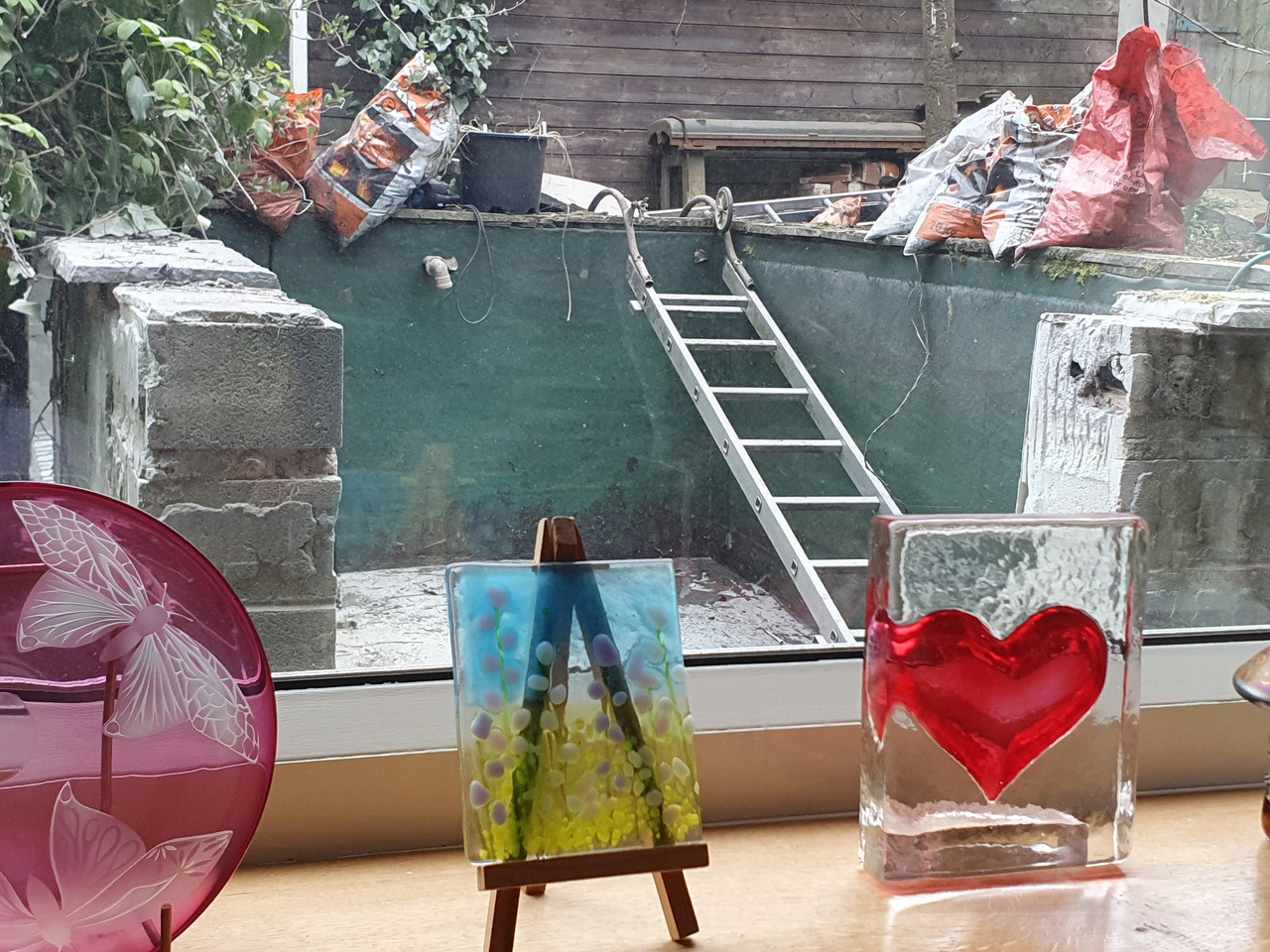 swmbo had a cunning idea, wouldnt it be nice to see the fishys from the house. Theres a window at the tea making area, so I spent a few hours chopping for another window.