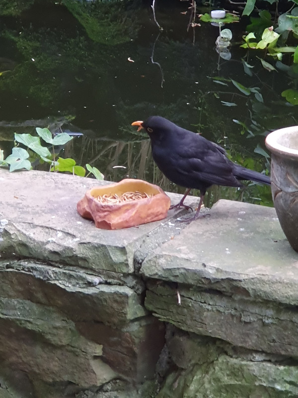 We seem to have adopted a black bird. He has a broken beak. The bottom does not move, I think he must of flew into something and snapped it. He came to the garden very tatty but has improved quite a bit. When he wants some food he goes to a window and stares in. I go out fill his bowl and whistle. Seems to have a scruffy robin in tow thats half way through a molt.